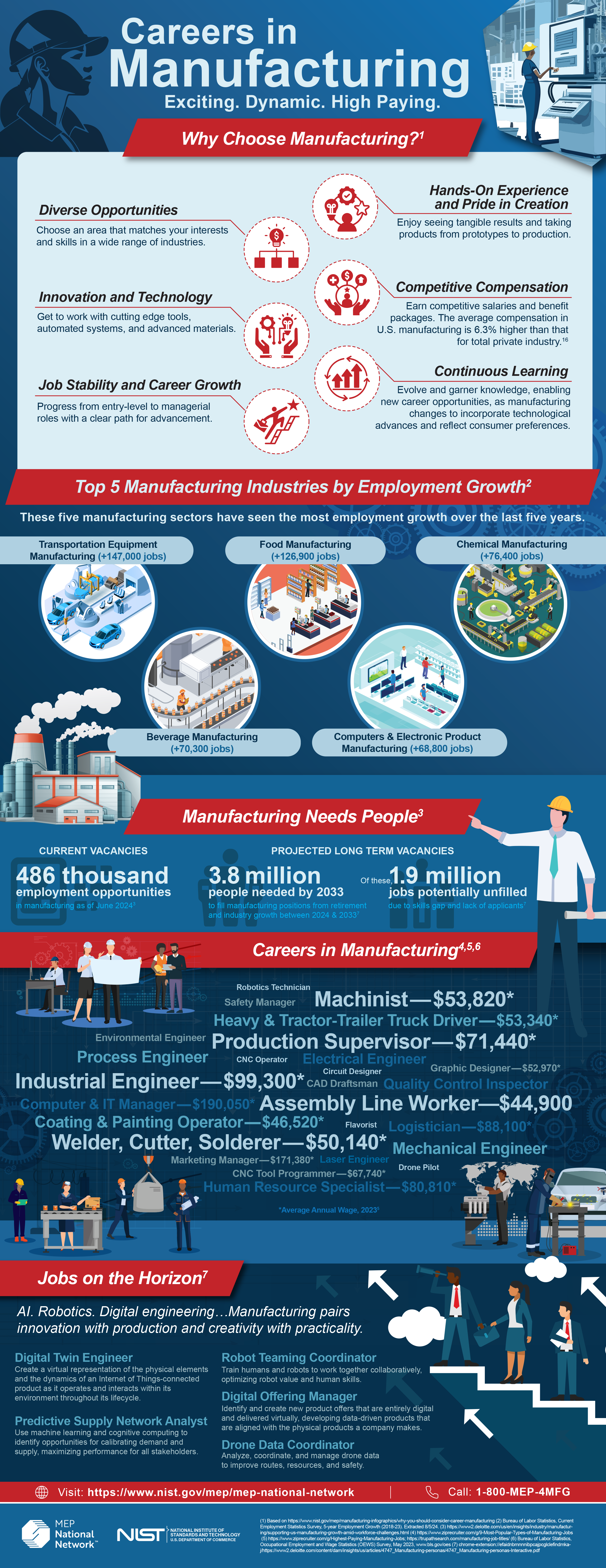 The “Careers in Manufacturing” infographic highlights why to choose a career in manufacturing, the top five manufacturing industries experiencing employment growth, various careers along with the average pay, and more! It can inspire the next generation of workers, motivate mid-career professionals, and raise awareness of the many opportunities the manufacturing industry offers.