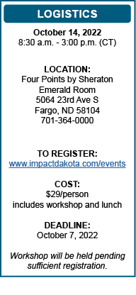 ONLINE REGISTRATION HAS CLOSED. Please call Impact Dakota at 701-204-7000 or 866-297-8250 if you are interested in attending.