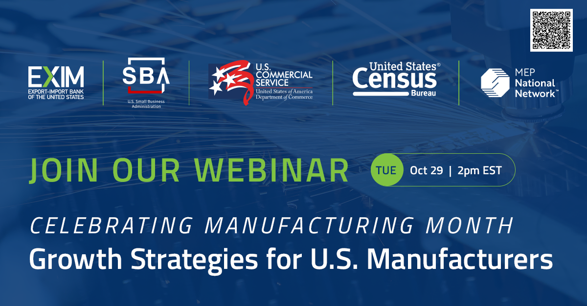 Celebrate Manufacturing Month 2024 and join us for this unique opportunity to learn about tools and strategies that can take U.S. manufacturers to next level sales success! NIST MEP is collaborating with the Small Business Administration (SBA), Export-Import Bank of the United States (EXIM), U.S. Commercial Service and Census Bureau on a webinar featuring strategies for small and medium-sized manufacturers to grow their sales, expand production capacity and engage in the global marketplace.