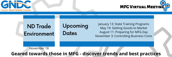 This is part of our MFG Virtual Meeting Series - these are held the second Thursday in the coming months of November, January, May, August. Members can request recordings of these sessions following their completion by emailing ndchamber@ndchamber.com.